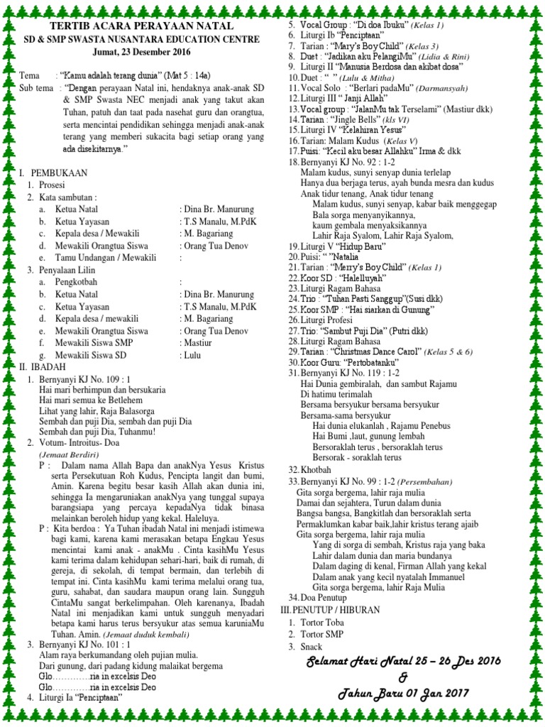 16 ) sub thema : Koor sekolah minggu (aku anak sekolah minggu) 16. Tertib acara perayaan natal osis sman 8 medan jumat, 13 desember 2019 thema: Jauh dari sorag tinggi kunjunganmu. Waaaah kami sebenarnya ada acara latihan menyanyi untuk natal besok.
